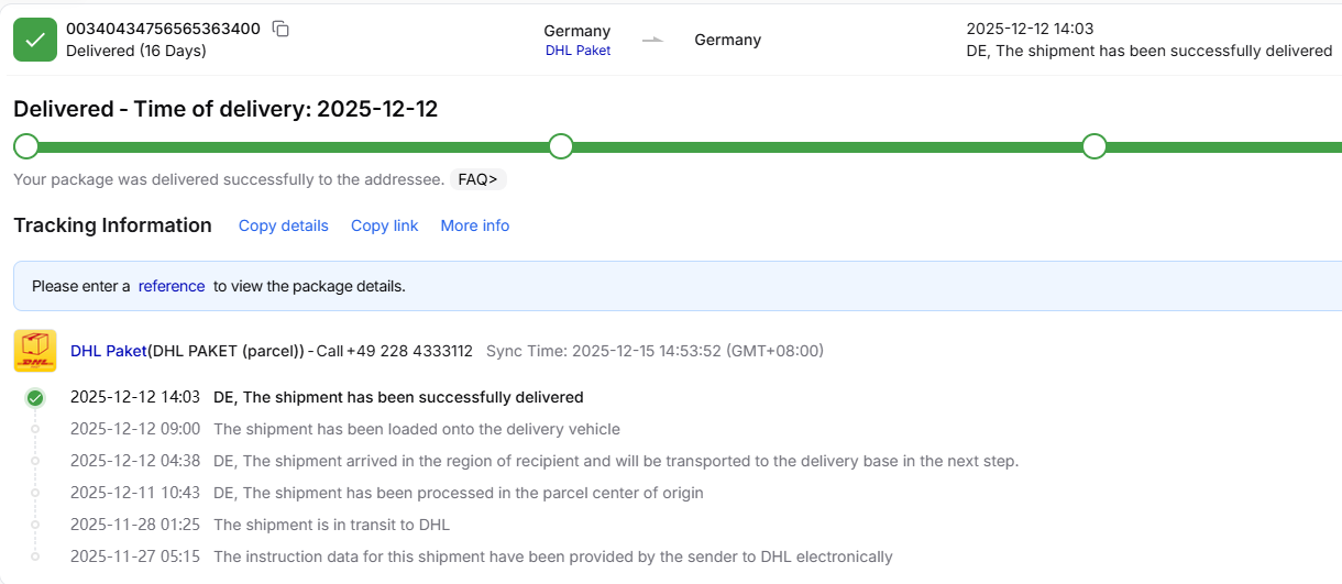⇒ Les informations de suivi logistique ne seront mises à jour que lorsque le colis sera reçu par l'agent en Allemagne, aux Pays-Bas ou en Belgique, et leur fréquence de mise à jour n'est pas aussi élevée que celle des services de messagerie classiques.